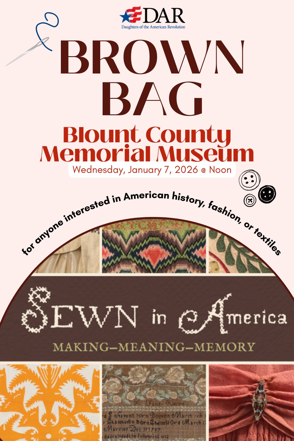 Bring your lunch, or not, and wear your red, white, and blue as we take a look at American history through fashion and textiles.โฃ